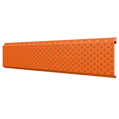 Линеарная потолочно-стеновая панель с ПЕРФОРАЦИЕЙ для вентиляции цвет RAL2004 Оранжевый Апельсин применяется в качестве софитов для подшивы крыши, наружной и внутренней отделки потолков, стен, фронтонов фасада дома в Казани.