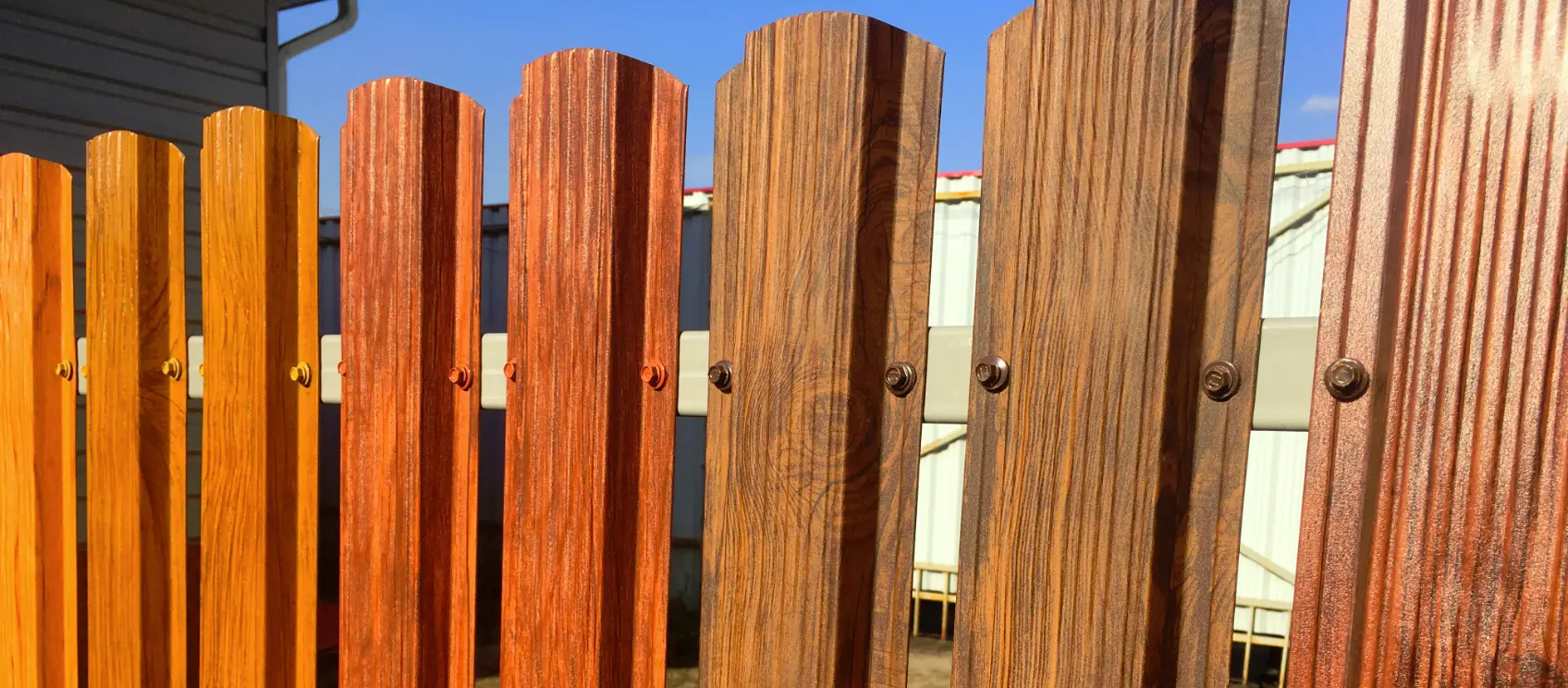 Металлический штакетник (евроштакетник) с покрытием под дерево для заборов и ограждений, палисадников в Казани - полный каталог и палитра доступных цветов евроштакетника с односторонними и двухсторонними покрытиями Printech (Корея), SteelArt (Россия), Принтек (Россия) имитирующими рисунок натурального дерева.