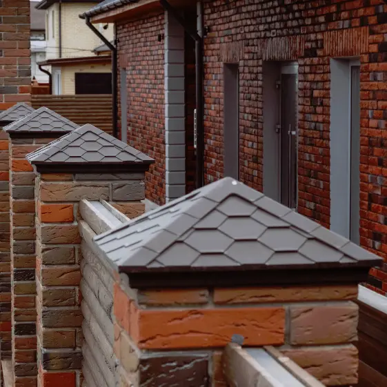 Полимерпесчаный колпак из коллекции Everest (Еверест) в коричневом цвете установлен на кирпичный столб забора. Такое декоративное и в то же время практичное решение завершает внешний вид ограждения, придавая ему аккуратность и стиль. Колпак надежно защищает кладку от воздействия осадков и продлевает срок службы конструкции. Фактурная поверхность под имитацию черепицы гармонично сочетается с мягкой кровлей и обновляет облик участка, делая забор более выразительным и современным.