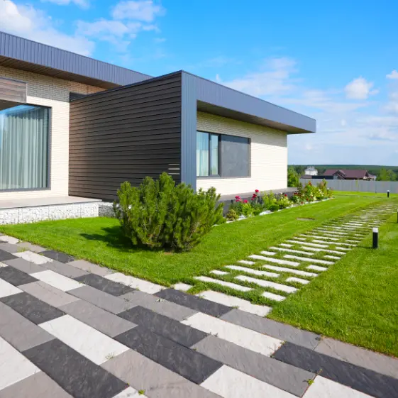 Шаговая плита STONE Черный Сланец на участке, Шаговые плиты для придомовой зоны и садовых дорожек, Металлосайдинг Евро-Брус под брус цвет Тик, RAL7024 Серый Графит на фасаде барнхауса, Металлосайдинг Евро-Брус Беленый Дуб, RAL7024 Серый Графит на барнхаусе, Дом Перевертыш с фасадом из сайдинга Евро-Брус разных цветов, Фасад МБОУ СОШ из металло сайдинга Евро-Брус под брус цвета в ассортименте, Пергола из металлопланкена Беленый Дуб Printech Корея