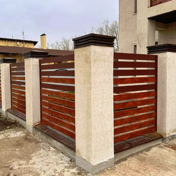 Сочетание планкена Темный Дуб 3D, RAL8017 МАТТЕ Шоколад на заборе ранчо, Колпак Bona Хай-Тек Коричневый на заборе из металлосайдинга Евро-Брус